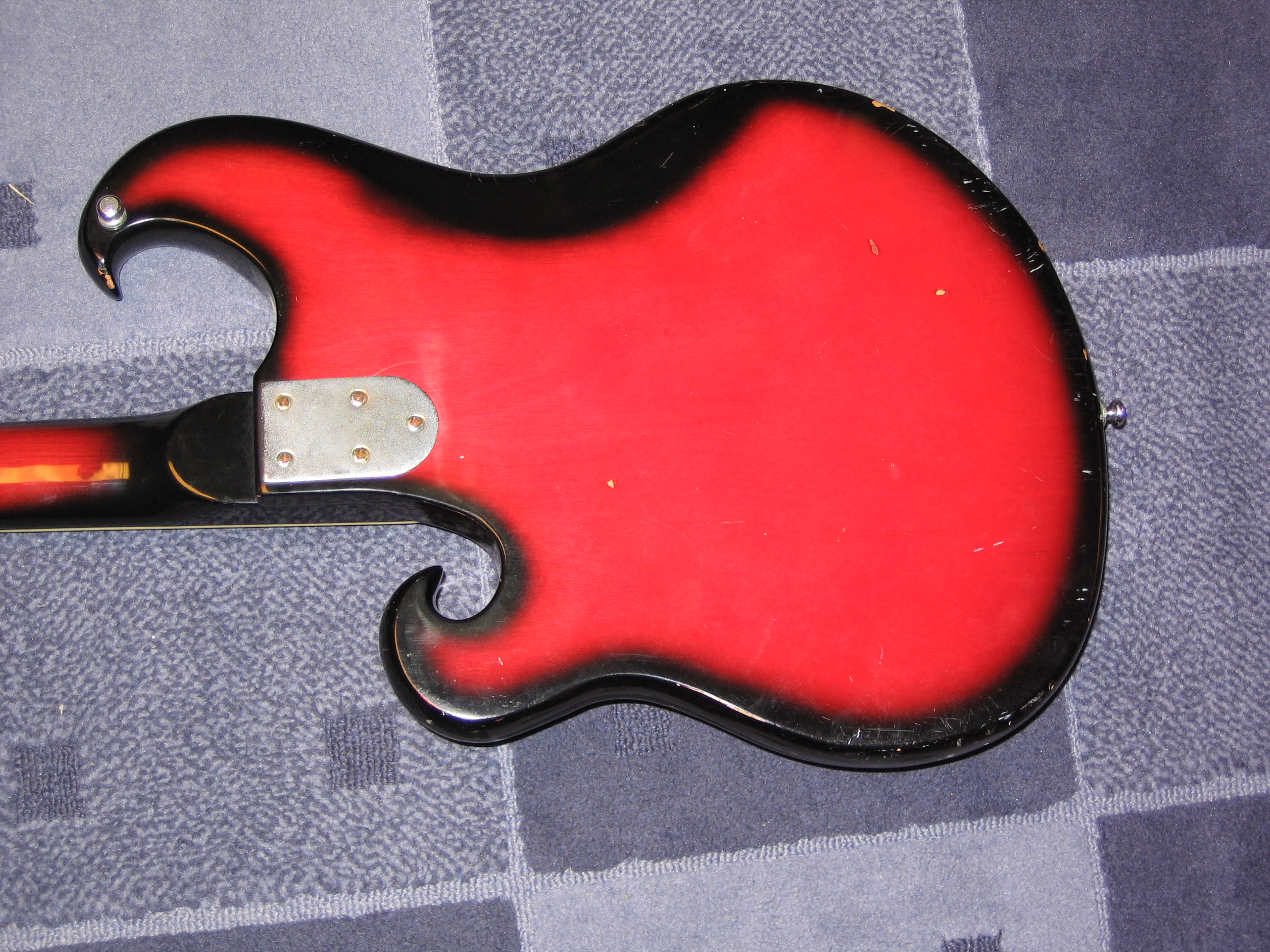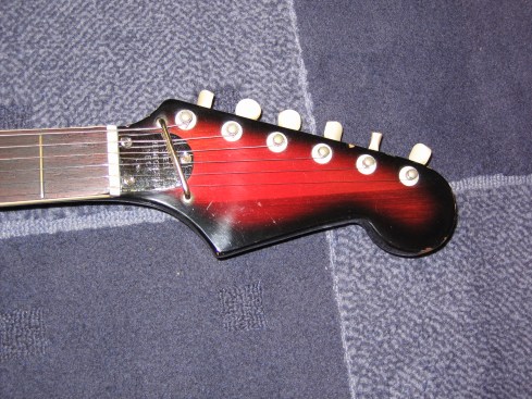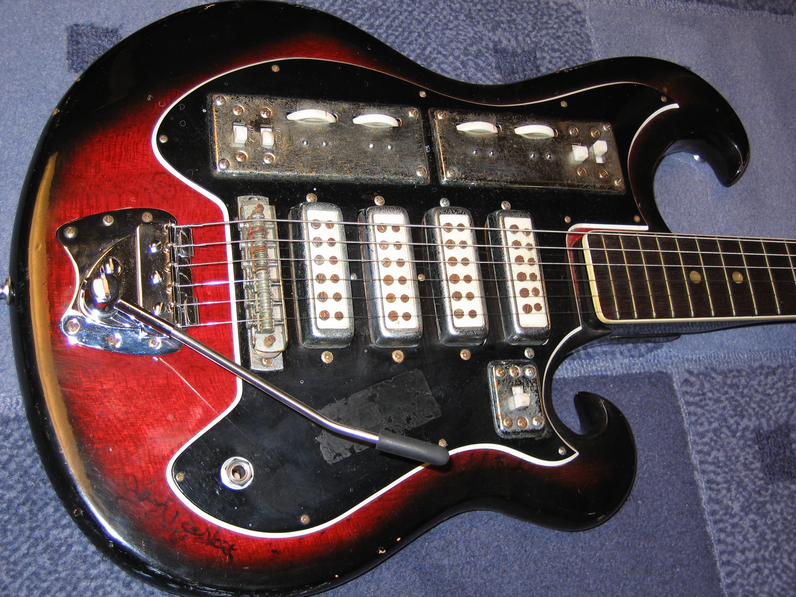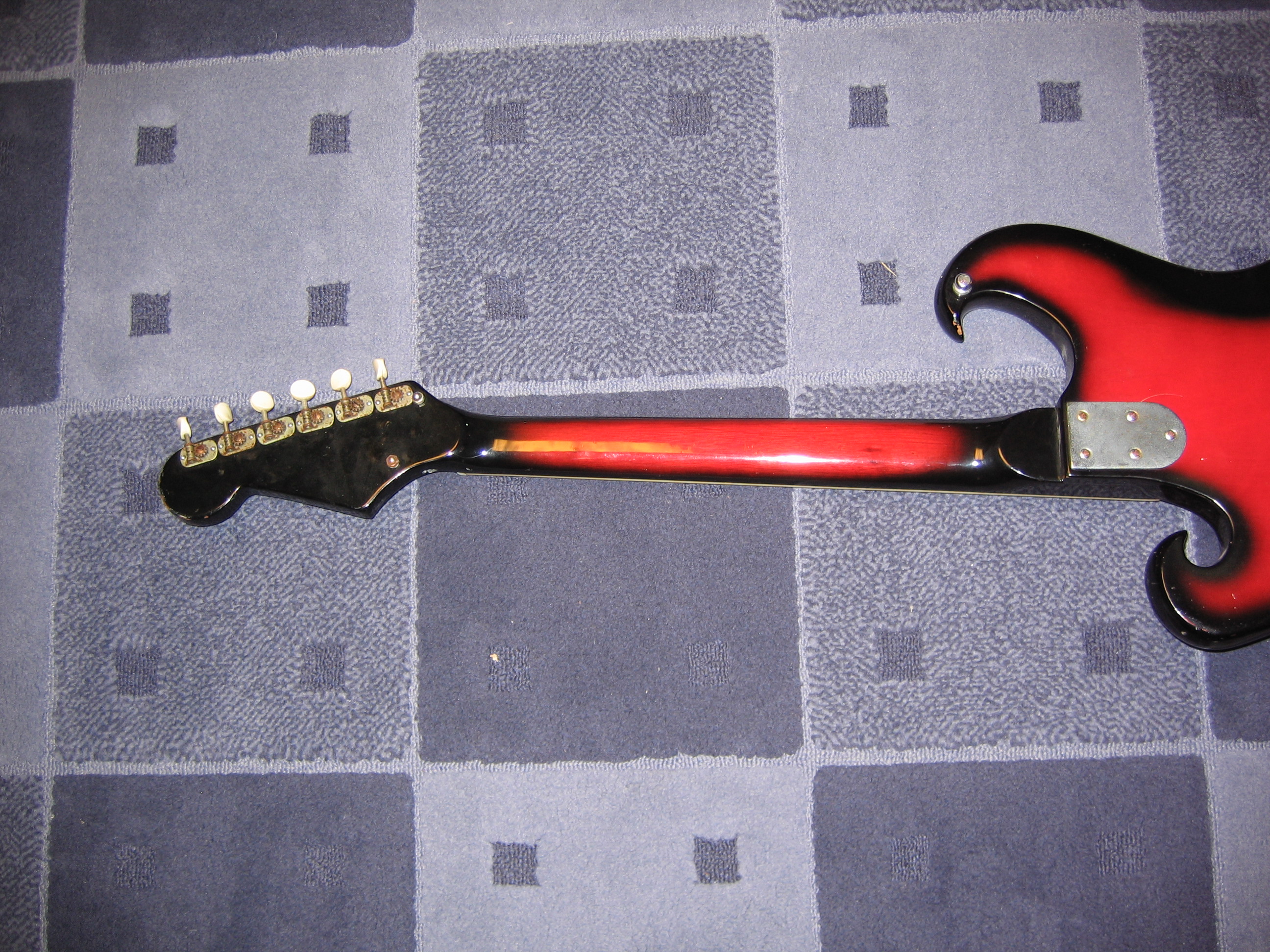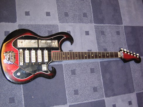 The binding was all intact and the bridge was useable. The tuners were the standard open gear types and it held a tune OK. Still don’t know who made this one but one day I was searching through some old catalogs and found this exact model, I believe it was from 1966-68 range. I found out it was called the Sekova Mentor. In 1967 list price was $149, and it was the most expensive guitar in the catalog. Here’s what they said in 67:“US-29 ‘Mentor”- Professional solid body four pickup model that is sharp, sleek, solid superiority loaded with drive and looks and SPECTONIC PROJECTION. Deluxe rosewood, celluloid bound oval fingerboard with inlaid markers; violin shaped double cut-a-way to make those high ones easy; deluxe heavy chrome plated individual machines. This model has the “exclusive” 12 screw adjustment on each pickup for the ultimate in sensitivity and unexcelled reproduction. The four pickups have fingertip wheel controls for volume and tone; 4 slide switch pickup controls and 2 solo and rhythm switches. heavy chrome-plated metal adjustable bridge and control panel; contrasting black pick guard with white underlay. 40″ long, 13.5″ wide. Mirror satin, polyester lacquer-gloss finish. This model only available in JET-RED SUNBURST and EBONY BLACK.”