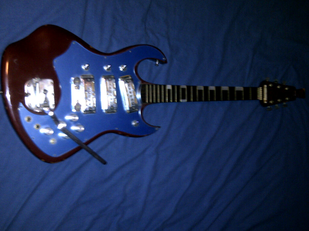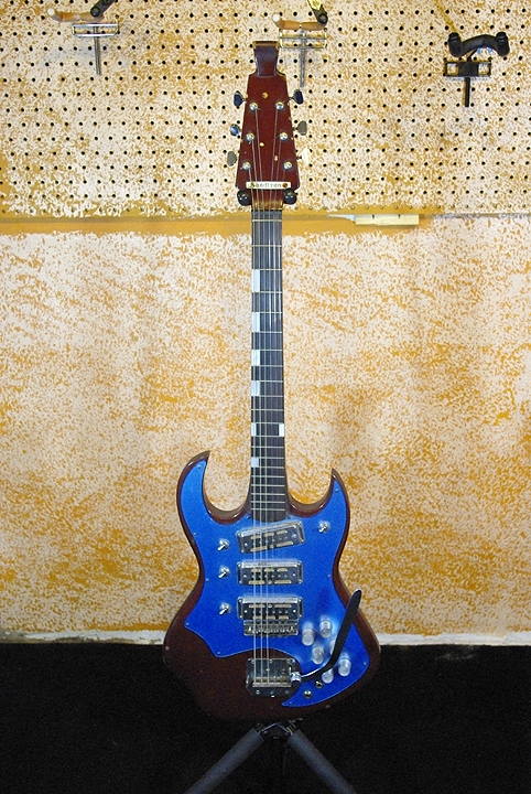 Geez Louise!  Here is quite possibly the weirdest, oddest, strangest. . . sometimes even I’m left speechless!  Peoples, seriously!  When I saw this Sandtron guitar I had to buy it just to see what it was!  At first I thought it was modified, since I never saw a vintage Japanese guitar with those four toggle switches.  And that pickguard!  It’s a thick somewhat transparent blue-ish color combined with the rust brown color of the guitar.  Good grief! I searched all over many catalogs and the Internet looking for information, and I came up “almost” empty.  I did happen to find one of these guitars listed on a defunct music store’s web page, and here’s what I found: