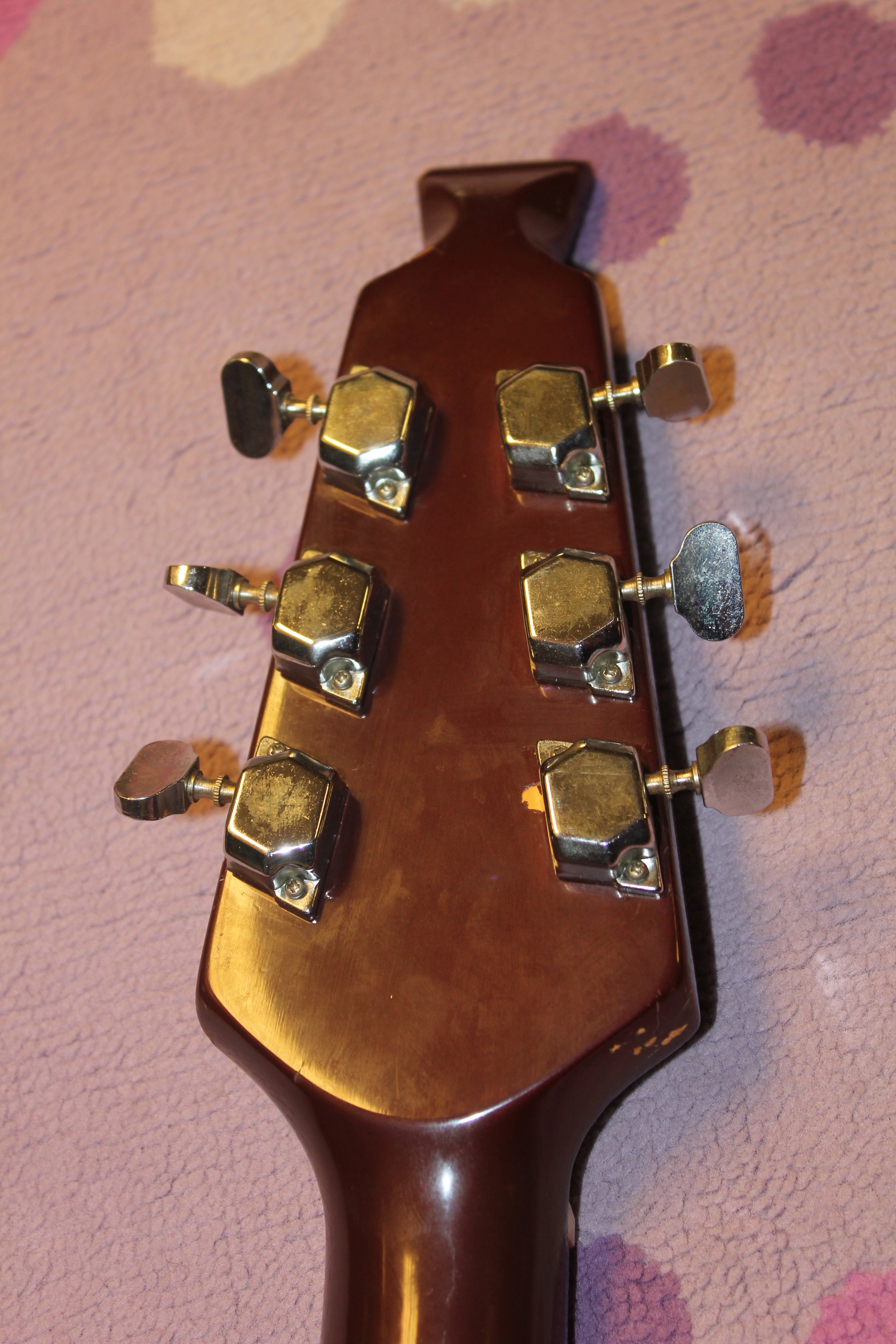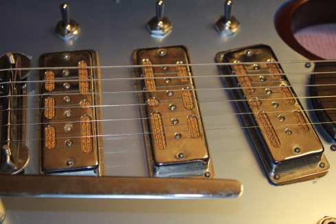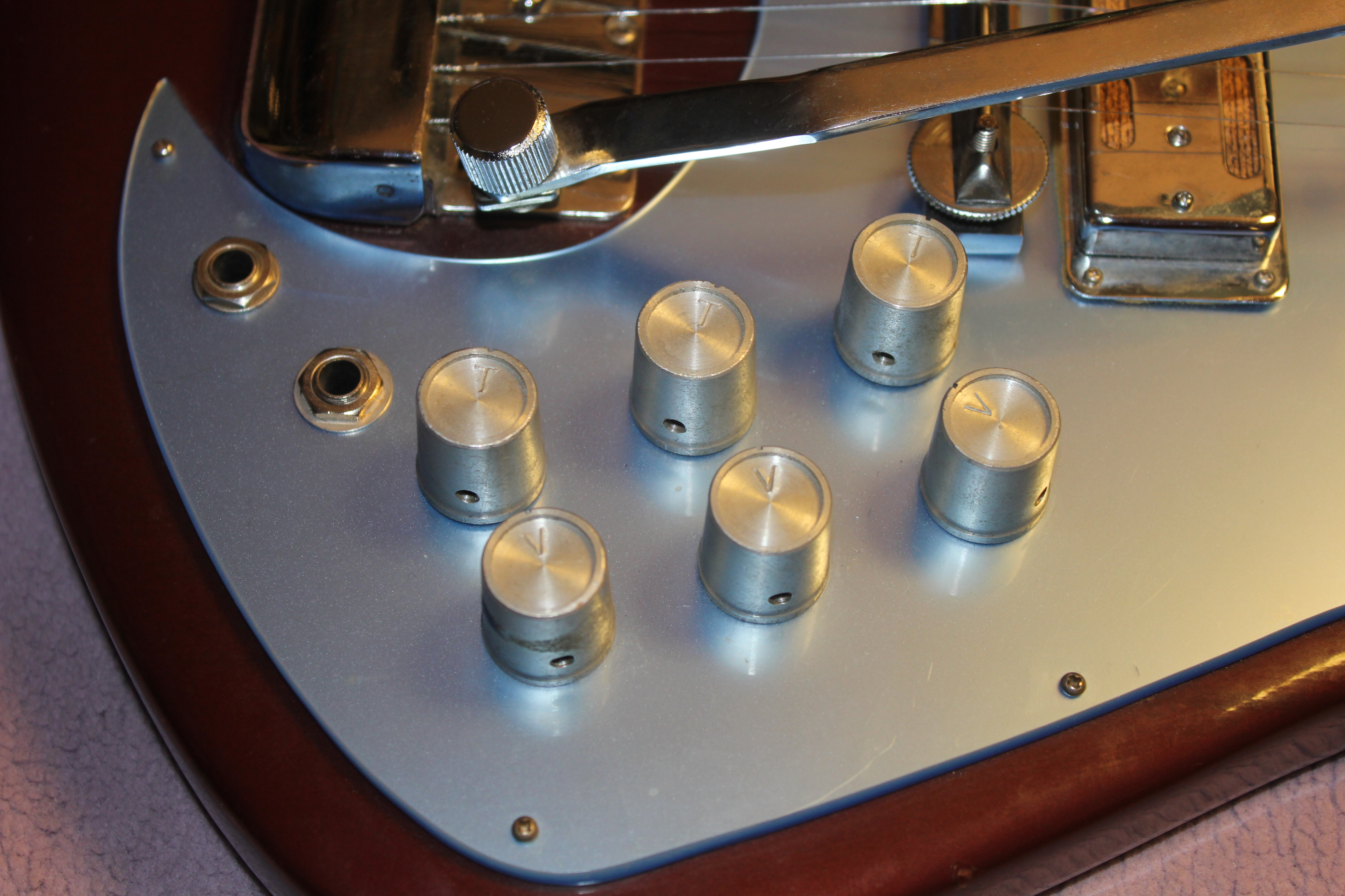 • Electronics – The pickups are VERY similar looking to the famous gold foil Teisco pickups, except that instead of gold foil, these have an almost “cork” like appearance.  Like a dull tan with little darker spots.  Again, very odd.  I found this pickup design on Zen-On guitars from the mid sixties.  Each pickup has an on/off toggle and a volume and tone knob assigned.  Additionally, there is a treble/bass toggle on the lower horn, and that has a subtle affect on the sound.  The wiring was bone stock and pretty well done.  This wasn’t a cheaply made guitar! The pickups all read in the 3.00k range, and do sound nice.  They’re snappy and bright, very typical of many Japanese pickups from the era.  Also, none of the pickups are microphonic and they handle fuzz pedals rather well!  Another oddity regarding this guitar is the dual inputs!!  They each do the same thing, so why is there two? Besides the obvious ability to plug into two amps simultaneously? Seriously, this thing just gets weirder and weirder!  And how about those knobs?  Someone told me that the knobs are very similar to what you would find on a Japanese stereo receiver during the same era.  Do they look familiar to any other guitar you’ve seen?