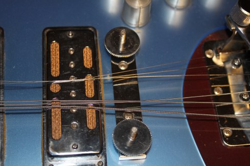 • Neck/Headstock – OK, so here’s where the guitar gets totally weird!  Check out that extra “thing” at the peak of the headstock!!!  What is that?!?!  I seem to remember there were some Eko bass guitars from the 60s that had some sort of “thing” up there on the headstock, but I’ve never seen something like this on a guitar. So odd.  The neck is also cool because of the fret markers, which are similar to some Teisco guitars.  Frets are typical tiny and the neck radius is slightly flatter than 7.25″ The neck is nice and chunky, and it set up pretty well despite there being no truss rod!  Also, the neck has a combo attachment, meaning the neck is set and screwed in!  This guitar also had the original flat wounds still on it!  Also, take a look at the hexagonal tuner covers.  Never seen those before!