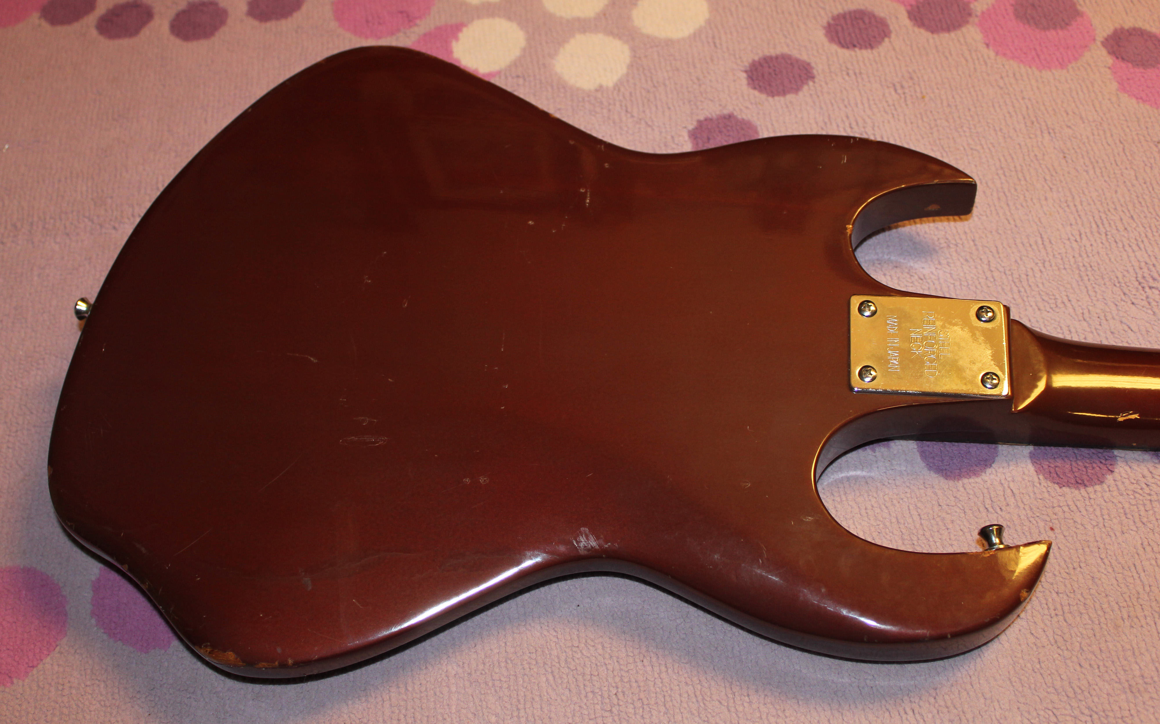 • Body – The paint is kinda thick and is reminiscent of Italian guitars of the 60s.  I call it the candy coating paint.  The body is carved so interesting.  It has these fluid, subtle carves on the front and back.  The belly contour and arm contour really flow into the rest of the body, if that makes sense.  It’s just artfully done.  The sharp, odd horns are offset, and overall the whole guitar is just aesthetically pleasing.  Well, other than the color combination of the body and pickguard!  Body looks to be made of high quality wood like mahogany, probably Sen.