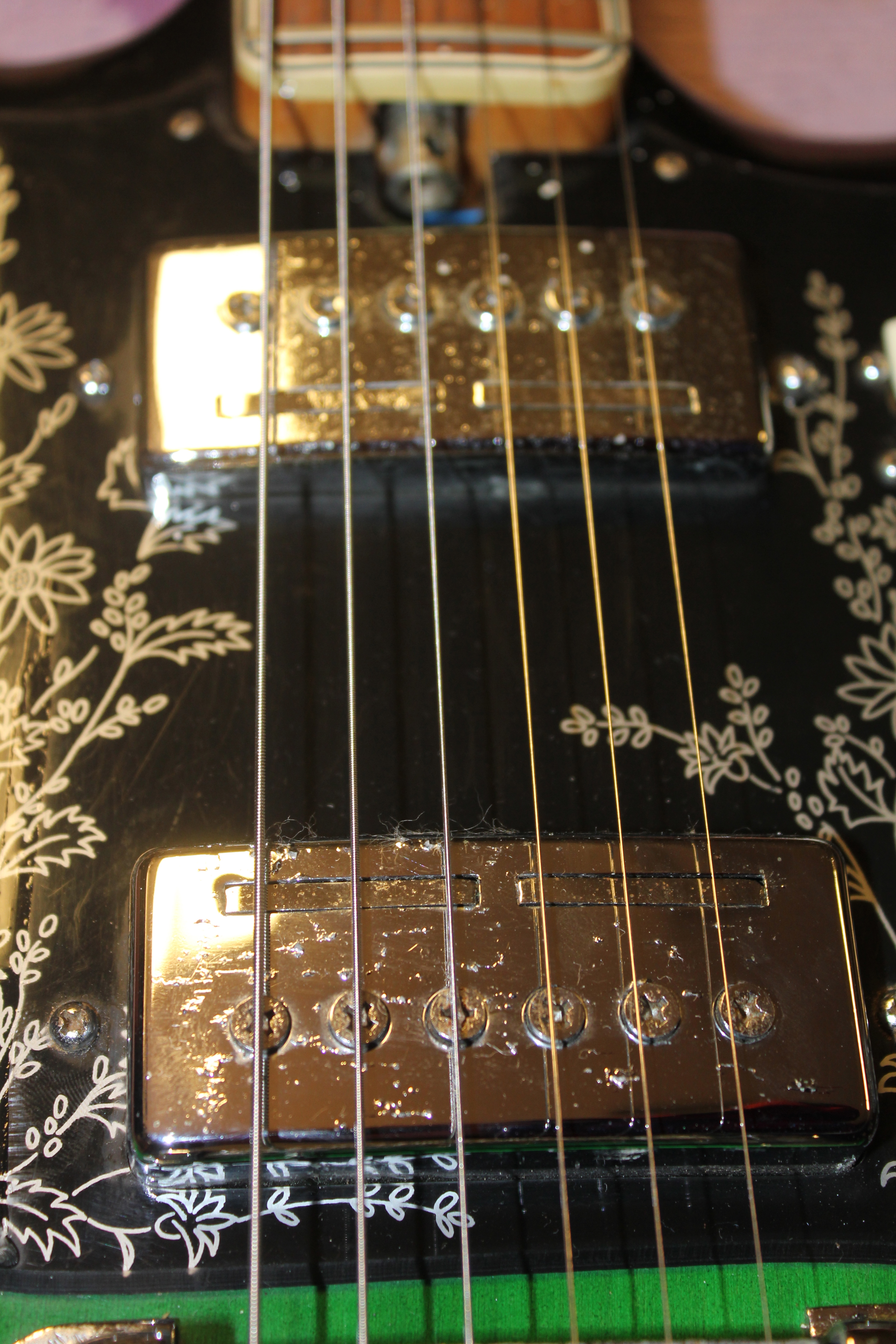Both of these *minor* mods were big gambles I thought, but they both turned out awesome even though I was hesitant about possibly damaging the brilliant emerald finish, plus the additonal gold hardware plus a little bit of wood from the rosewood bridge mount add to the design.