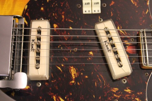 All the Kent tremolos had that bridge mute attached, and overall the Kent units are really effective. The tuners are serviceable and the pickups read out at 9.02k for the bridge and 9.17k for the neck. That’s some really good output! Unfortunately, the wiring scheme is not optimal or series and with both pickups on the output drops to 4.55k, so this is an example of less is more. Meaning, the two pickup model is the most desirable from a player’s standpoint. Plus when you see the four pickup model, the switches and knobs are really crammed onto the pick guard! There’s also a rhythm/solo switch, and I have to say it sounds better in the rhythm position. It just gives the guitar more oomph!