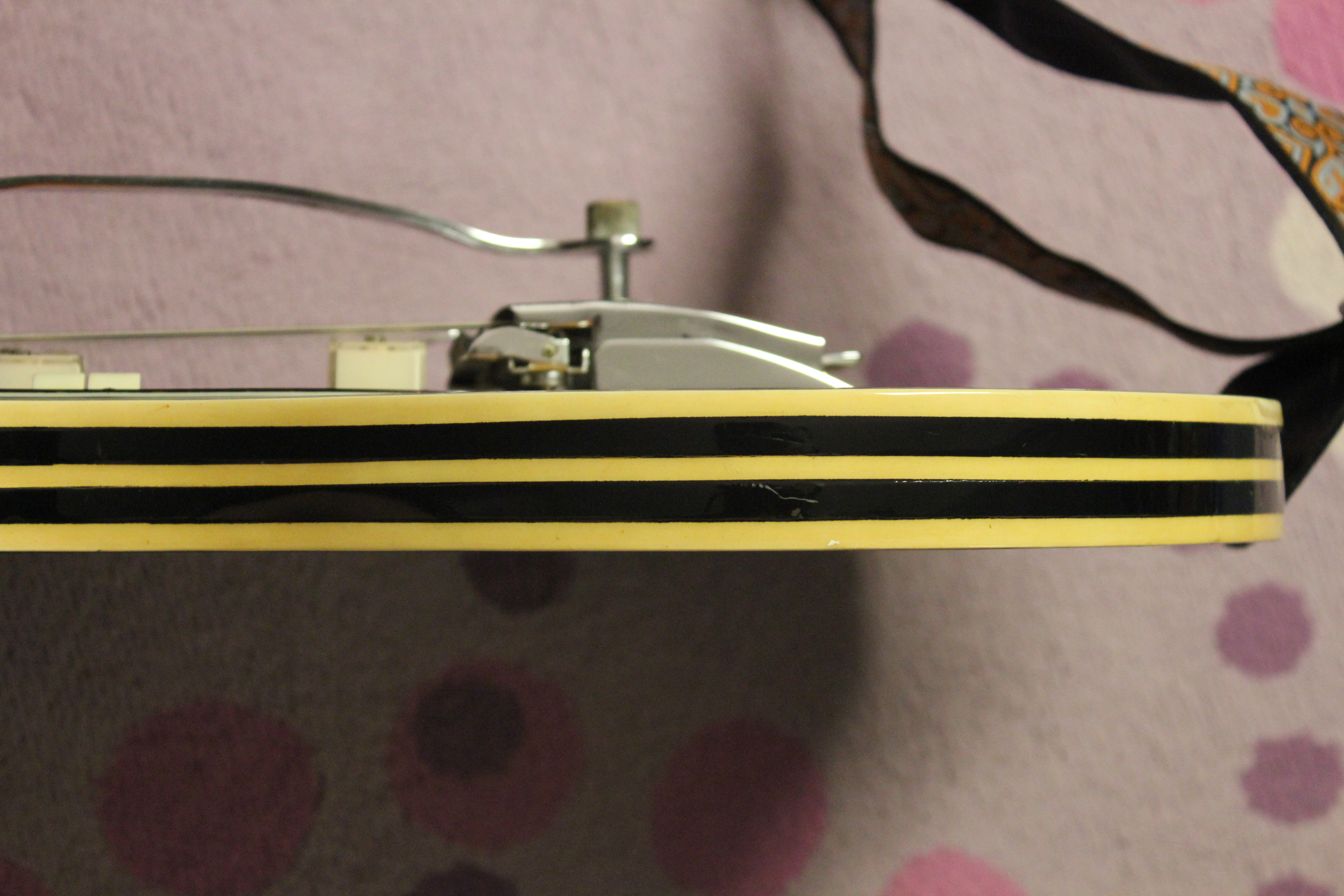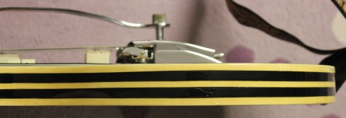 Notice the little “Kent” lettering on the pickups? There’s little tasteful (or tacky) touches like that all over! Strapping on one of these Kent 700 guitars is sort of different. Like, it feels like a semi-hollow body guitar at first. But the bodies are rather heavy and feel solid. In comparison, the necks are on the thin side. The bodies are 14″ wide and 19″ long, and the bodies are 1 3/8″ thick. Those horns are really pleasing to my eye, but the racing stripes are where it’s at! The 1968 Kent catalog described the styling as “Rally Stripes.” The stripes seem like strips of vinyl glued around the sides and then lacquered over, but I could be wrong about that. The stripes are definitely not made of wood!