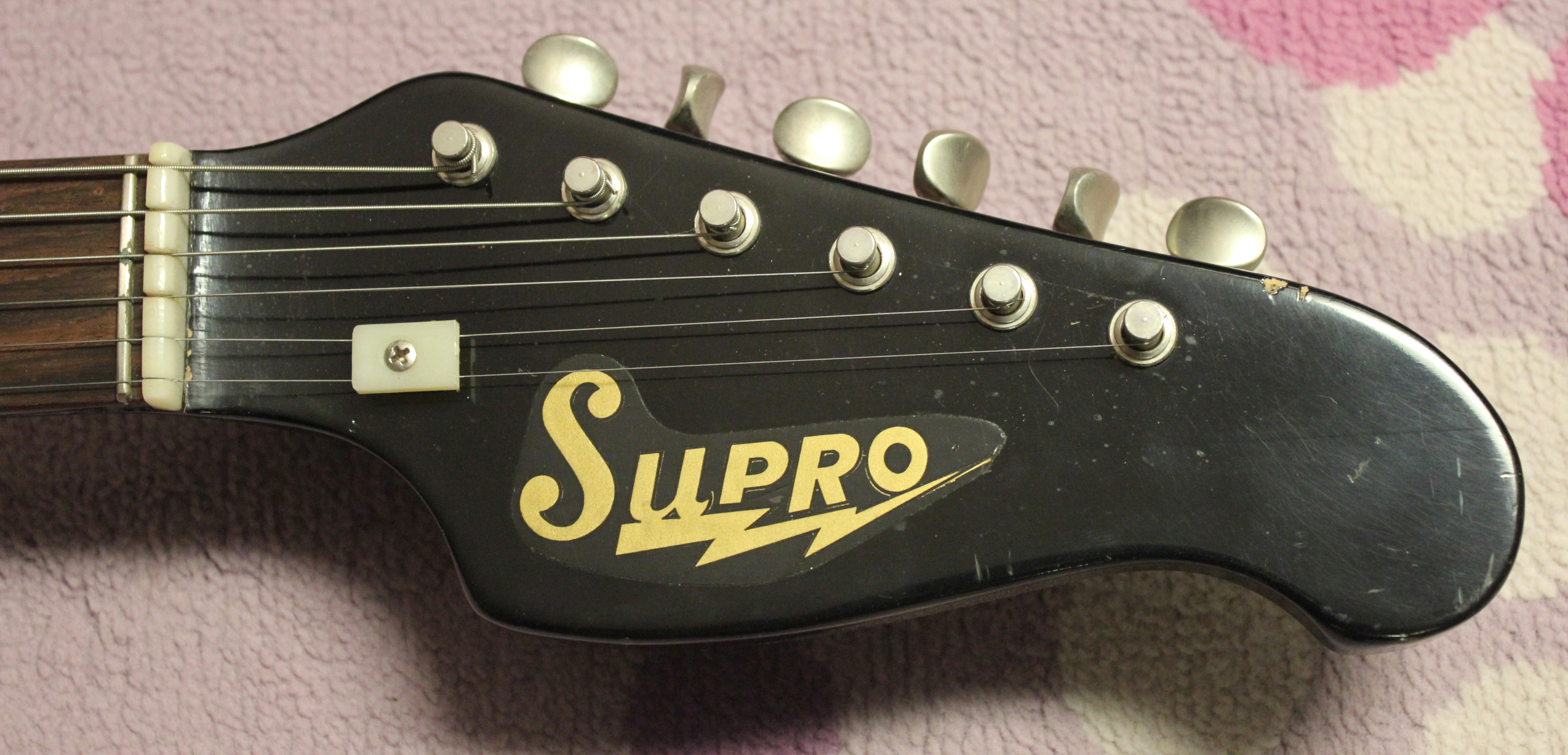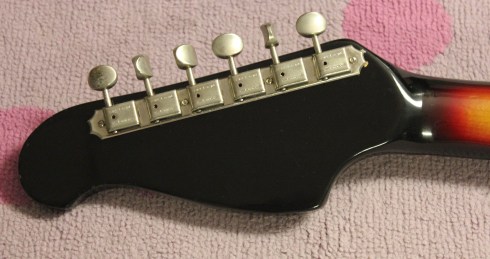Bodies were made of solid wood (alder?) as were the “thin-line” necks, which included a non-adjustable “Kord King” design which were guaranteed never to warp or bend!  What that means is that Valco used an aluminum rod in the neck, but it’s not adjustable!  I suppose it sounded good at the time, but once these necks became warped, they are just about done as playable guitars. The Supro logo was a sort of clear sticker applied to the headstock, above the finish.  Neck has a zero fret, one plastic string tree, and VERY NICE old Kluson Deluxe tuners were found on the two and three pickup models.