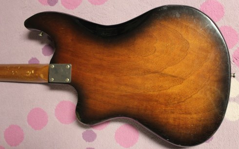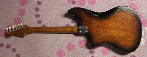 The wiring on this guitar is parallel, and there is a functioning tone switch next to the volume and tone knobs. The pickups are all turned on and off by corresponding switches, and with a little work by Dano, they all function perfectly. This guitar also has an aluminum pickguard, and I think something has to be said about this. Dano points this out all the time, that guitars with aluminum pickguards seem to have this special extra sound thing going on. Maybe it’s the way the metal vibrates, or the way the pickup magnets affect the surrounding metal, or maybe everything just “breathes” differently from plastic. There is just something extra with metal guards. I happen to agree!