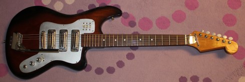 I was initially totally stumped as to who made this guitar. As usual there aren’t any identifying markings anywhere. Normally I just say “Kawai” when I see an oddball guitar like this, and after consulting a few different forums, I think I narrowed this guitar down to the late 60s period when Kawai had purchased Teisco and churned out very strange guitars that have similarities to older models offered by both Teisco and Kawai. Check out that headstock and that interesting slanted carve. It is something I’ve seen a few times before. A fine guy on the Matsumoku forum pointed out that this guitar’s body is very similar to the TG series Teiscos. Remember the “Monkey Grip” guitar? I bet there were a bunch of old Teisco bodies that just didn’t make the cut back then, so Kawai just used them up by dipping them in a thick finish to cover up any imperfections! That’s just my theory, but I do know that most of the Japanese factories were very cost conscious, so who knows? Either way, this is just a cool, playable vintage guitar that deserves some love, and that’s just what we all gave this old gal! Finally check out Mike Dugan playing this guitar. We used a Fulltone OCD for the dirt, and the faithful Ampeg Gemini I for the amp. Enjoy!