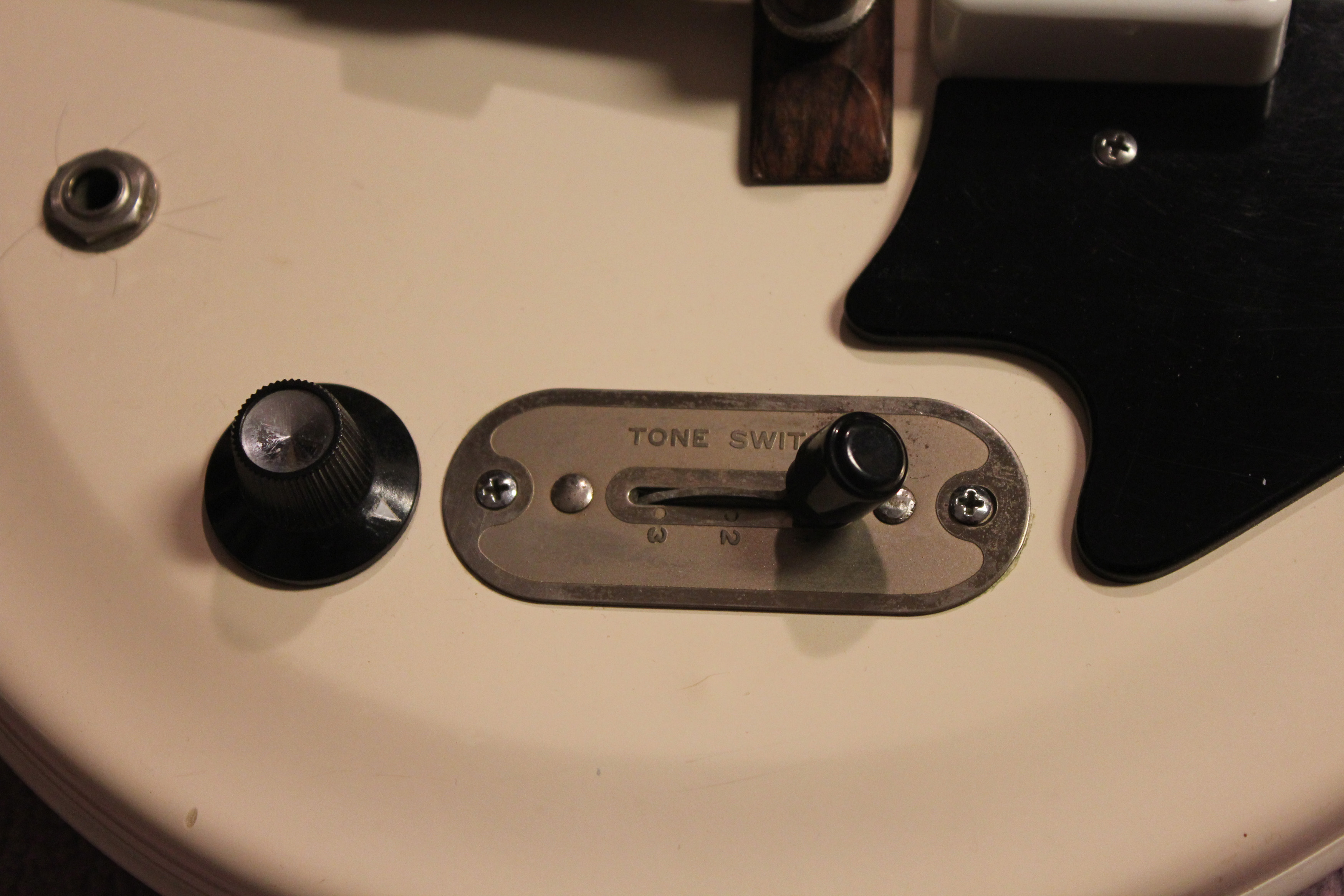Unlike Fender and Gibson, Valco more associated control knobs with switch positions rather than individual pickups. In a guitar with a saddle pickup (something they developed in the 1930s based on coils mounted in the bridge base and magnets hanging down from the underside of the saddle), the selector switch actually selects different tonal options rather than specific pickups. On the early version of the Coronado (black, full depth single cutaway archop with 2 face mounted pickups and one in the bridge) the only accessable controls were the master volume and 3 way “tone” selector switch. Mounted in the face of the body were 6 set screws, a pair for each switch position, that allowed for pre-set volume and tone settings for each of the switch positions. Tone controls often were bass roll off rather than treble roll off, and like some Rickenbackers, there is often a preset r/c network that rolls off the low end (and output) before the sound gets to the jack.