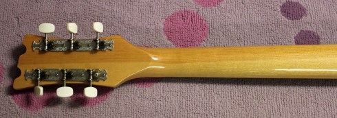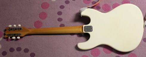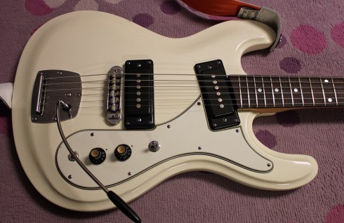 Now I know many people scoff at guitars such as these, which are obvious copies of Mosrites.  The Japanese people of the 1960s were OBSESSED with the Ventures (they still are to some extent), and there were many Mosrite copies coming out of Japan by the mid 60s.  But I have to tell you something, these guitars are REALLY GOOD PLAYERS!  Some would even say better than original Mosrites!  I know, I know, it’s sacrilege so disparage the name of Mosrite in any way.  Hey, I like Mosrites too!  But when you’re honest, you call a spade a spade, and these Univox Hi Fliers (when they’re set up properly) are really good.  The P-90s in these guitars are strong, crisp, and clear.  They’re very good!  They read out in the high 5k-low 6k range, and they sound just as good as any Mosrite pup I’ve ever heard!  You don’t have to agree with me, or believe me, but it’s true in my mind!  Now the necks on very different when you compare the two guitars, but I was never a huge fan of the Mosrite neck profile.  I know, how can I say such things!