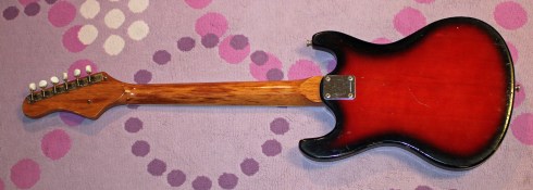 Yep, this is one lil rockin’ guitar!  It’s another great example of the hidden gems out there in cheap guitar world.  Most of the time I see Cameo guitars come as hollow bodies, but this beastie is a good example of a later 60s solid body.  I believe this guitar was made by Sakai woodworking in Japan, and the slightly Mosrite shaped body combined with a solid one-piece neck makes for a cool guitar.