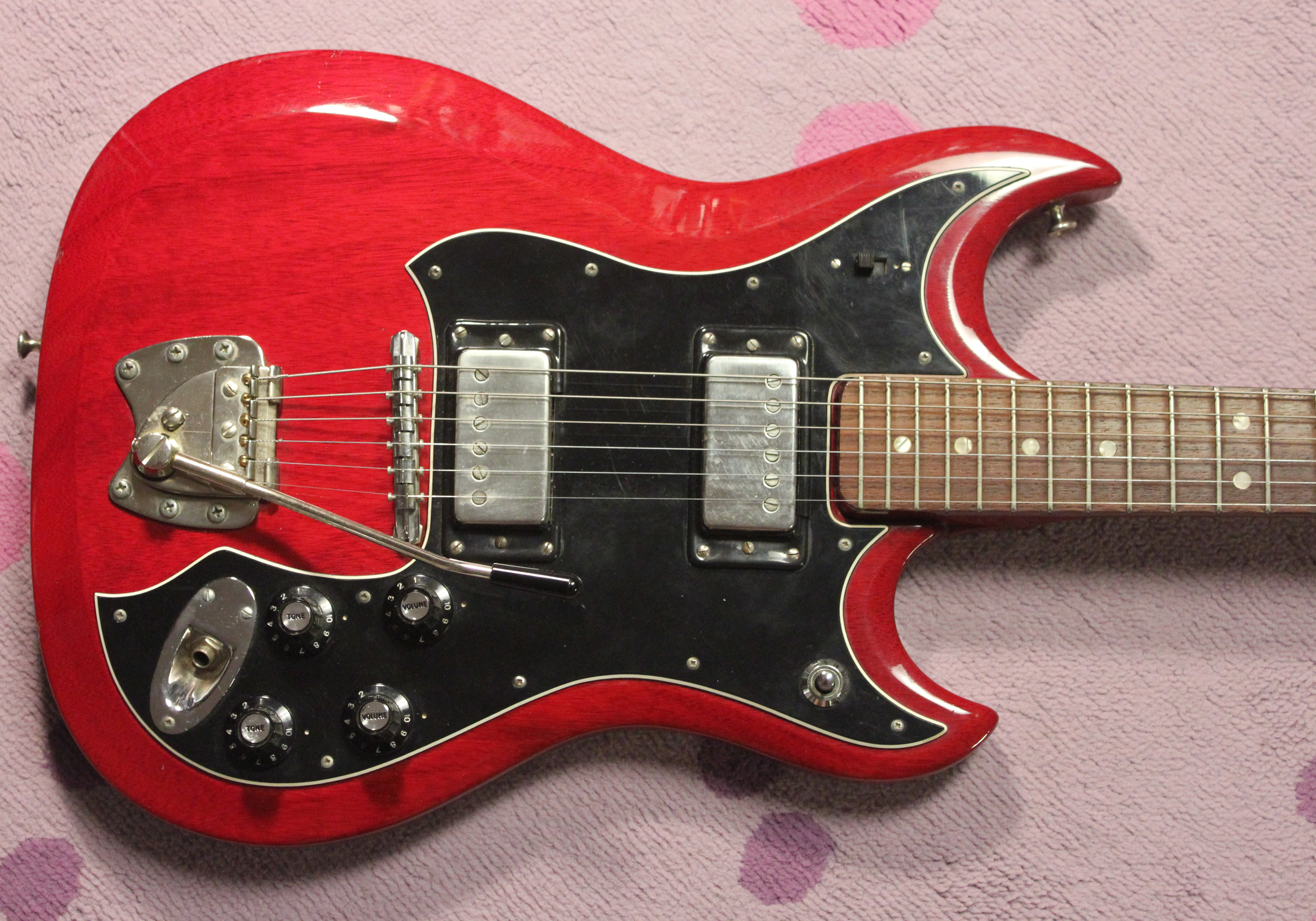This Hagstrom body style first appeared around 1965, but the humbuckers and wide headstock design didn’t arrive until 1969.  Listen, I LOVE Hagstrom guitars!  I love the early sparkle stuff, I love the single coil, vinyl, mesh stuff.  I love the big ol’ Vikings and the big ol’ Swedes.  But this model, right here, is my “desert island” Hagstrom!  When I was younger a friend of mine had a black one just like this, but with a stop tailpiece.  Years later I answered a Craigslist ad and drove 65 miles one way to get this cherry killer.