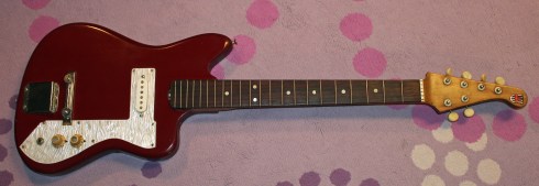 I still haven’t been able to figure out who produced this guitar, and I may never figure it out. Nothing about this guitar matches anything else I’ve ever seen, and is unlike any other St. Moritz I’ve ever seen. So in this way it stands alone, so to speak. I know that back in the early 60s, as demand for electric guitars was starting to grow, factories that had previously been making shoes, barrels, and cabinets had entered the Japanese guitar market. This guitar probably came from an odd factory like that. There was also a rather big mistake made on this guitar, and if you read my last post on the Valiant guitar, consider this the sequel…