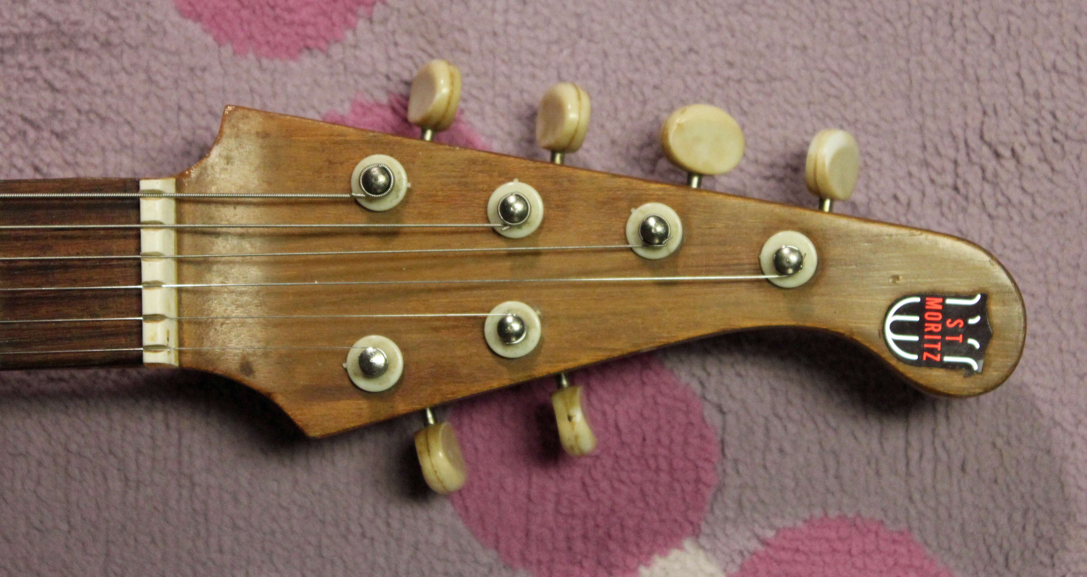 So check out that headstock! This definitely predates the Teisco design of a few years later. So in a way, this guitar is historic!! The St. Moritz name belonged to Manahttan Novelty Corporation, and was applied to some very early imports. This name and the guitars are very rarely seen, and most all the St. Moritz guitars I’ve come across are really strange and a little crude. Definitely need lots of work!! This poor old guitar sat in a basement in NYC for 50 or so years, and I bought it at a yard sale, or tag sale, or garage sale depending on your locale.