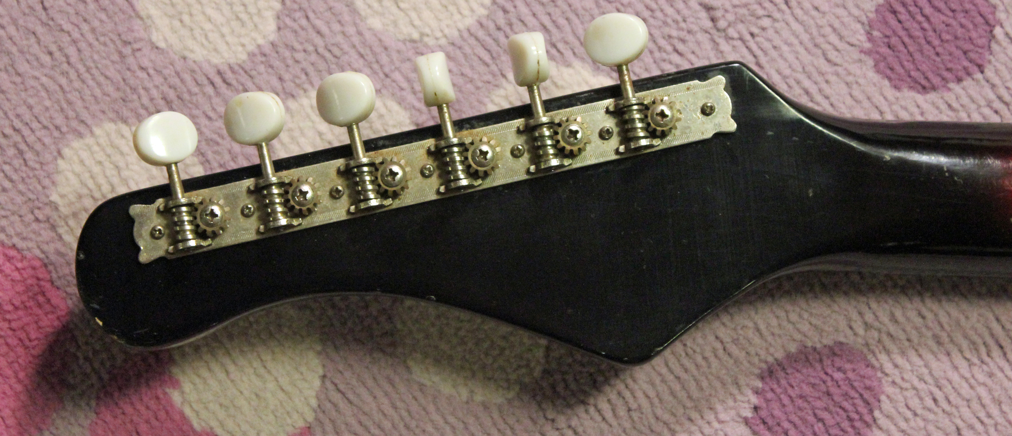 I’ve seen these guitars labeled as “Fuji” and “Ralston” and probably others that I can’t remember at the moment.  This big bar string retainer is seen on quite a few other guitars, and it was a common accessory.  Notice how this guitar doesn’t have a zero fret?  That means the nut had to be cut properly for this thing to play right.  And you know what?  It wasn’t!  In fact, the nut slots were cut rather poorly.  But now that it’s all sorted out, man, what a player!