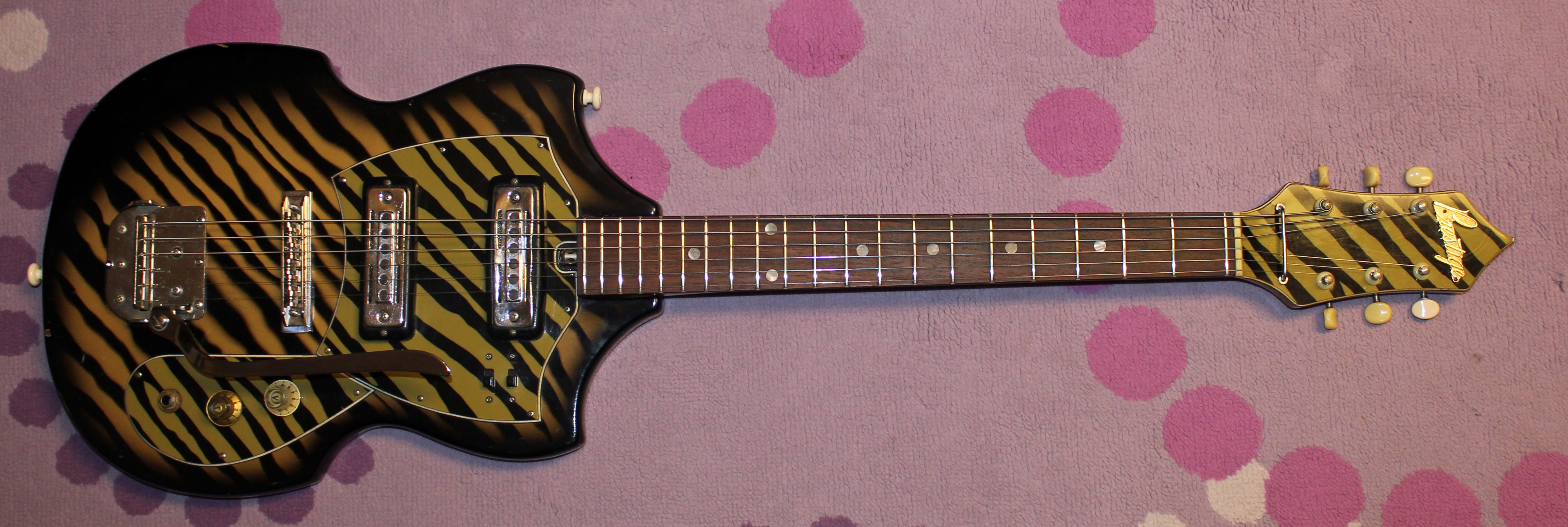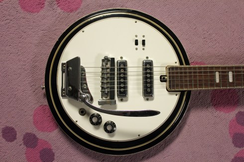 Well even though we’ll probably never be able to recognize the imagination of the original designer, we do know who produced this guitar….Kawai.  Yes, this model was called the CB-2V (Concert Banjo) and was made by Kawai for only one short year in and around 1968.  In fact, 1968 was an interesting year at Kawai.  They had just bought up Teisco the year before.  In 68 Kawai decided to update almost its entire electric guitar line, and several models such as the Flying Wedge and the Tiki Mask.  Thankfully, this model didn’t have the same pickups as the Flying Wedge!!  In fact, these pickups are really strong for this era of Kawai (pickups tended to get weaker as less and less wire was being used to wrap the coils, to cut costs).