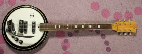 Oh yeah, it’s a guitar.  Shaped like a banjo.  Remember that scene from the movie Deliverance?  The dueling banjos?  If I was in that scene, this is what I would’ve been playing.  Straight through a cranked old Supro amp!  I really wish I knew the designer of this guitar!