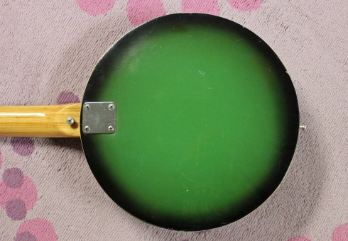 These guitars are rarely seen in the states, but when they are seen they usually had the Winston brand name (or sticker residue).  In Japan these were sold as “Concert” or “Splender”.  The guitar is built really interestingly and has some cool features.  Check out the triple neck binding!  It also has the bridge mute which can be flipped up to get that, well, muted sound.  The body was solid under the pick guard, but the large round guard really gives the appearance of a banjo.  From a distance, it can be deceiving!