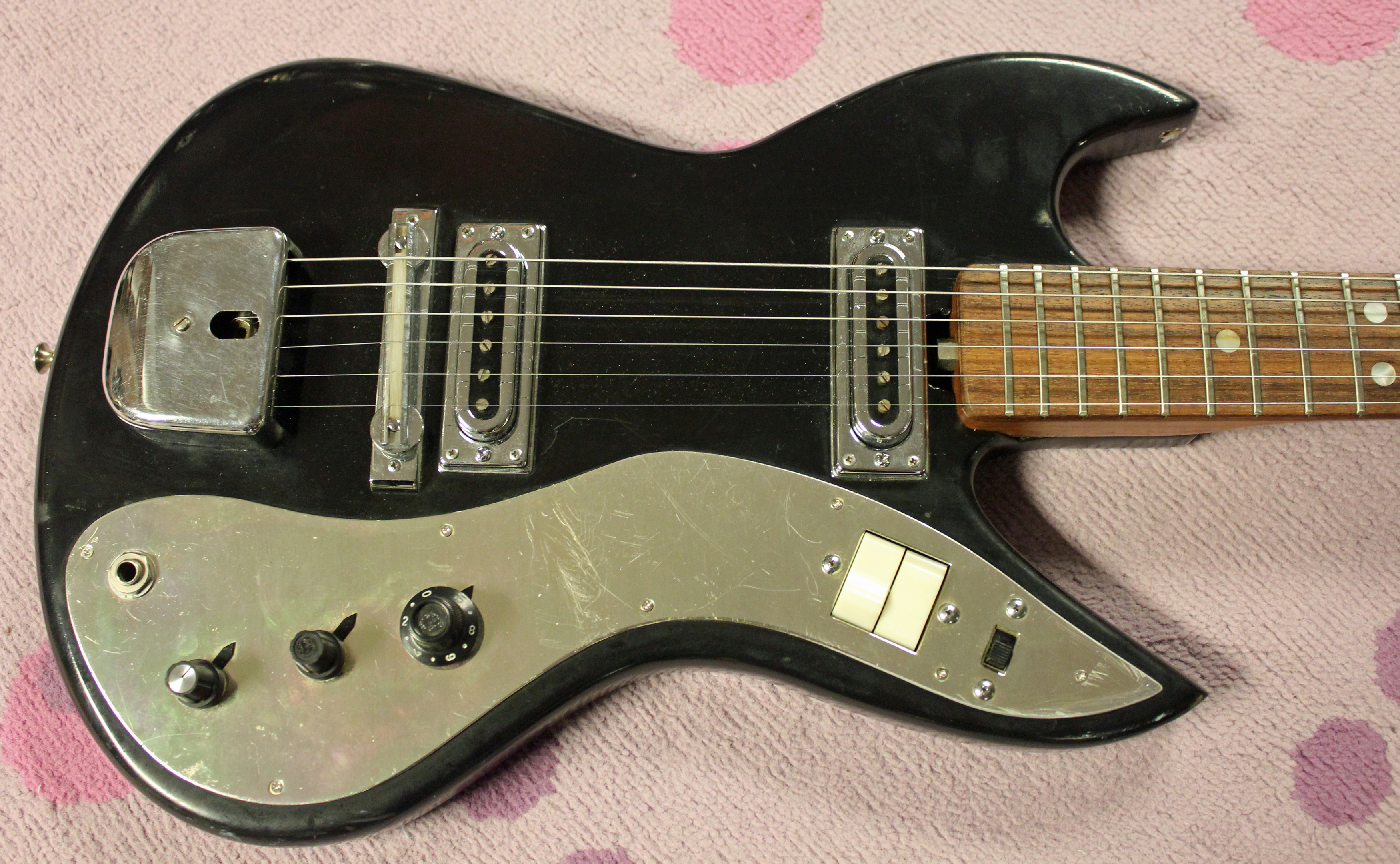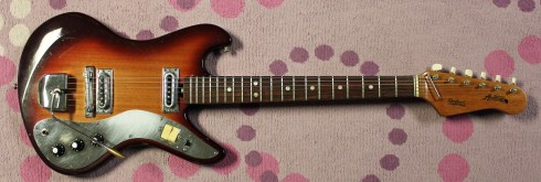 Tres Cool! I’ve got two of these… one is identical to your sunburst. But the other, also a ‘burst, but with a full pickguard that encloses both pickups. It is a huge piece if metal, but style-wise, i like it better that these other smaller guards. I’ve yet to string these up and hear them- one has a dead neck pickup… 😦 I think the standout thing, is the necks! Each one has the different headstock shapes as well, one with “SUPER ASTROTONE”, one without. hmm….