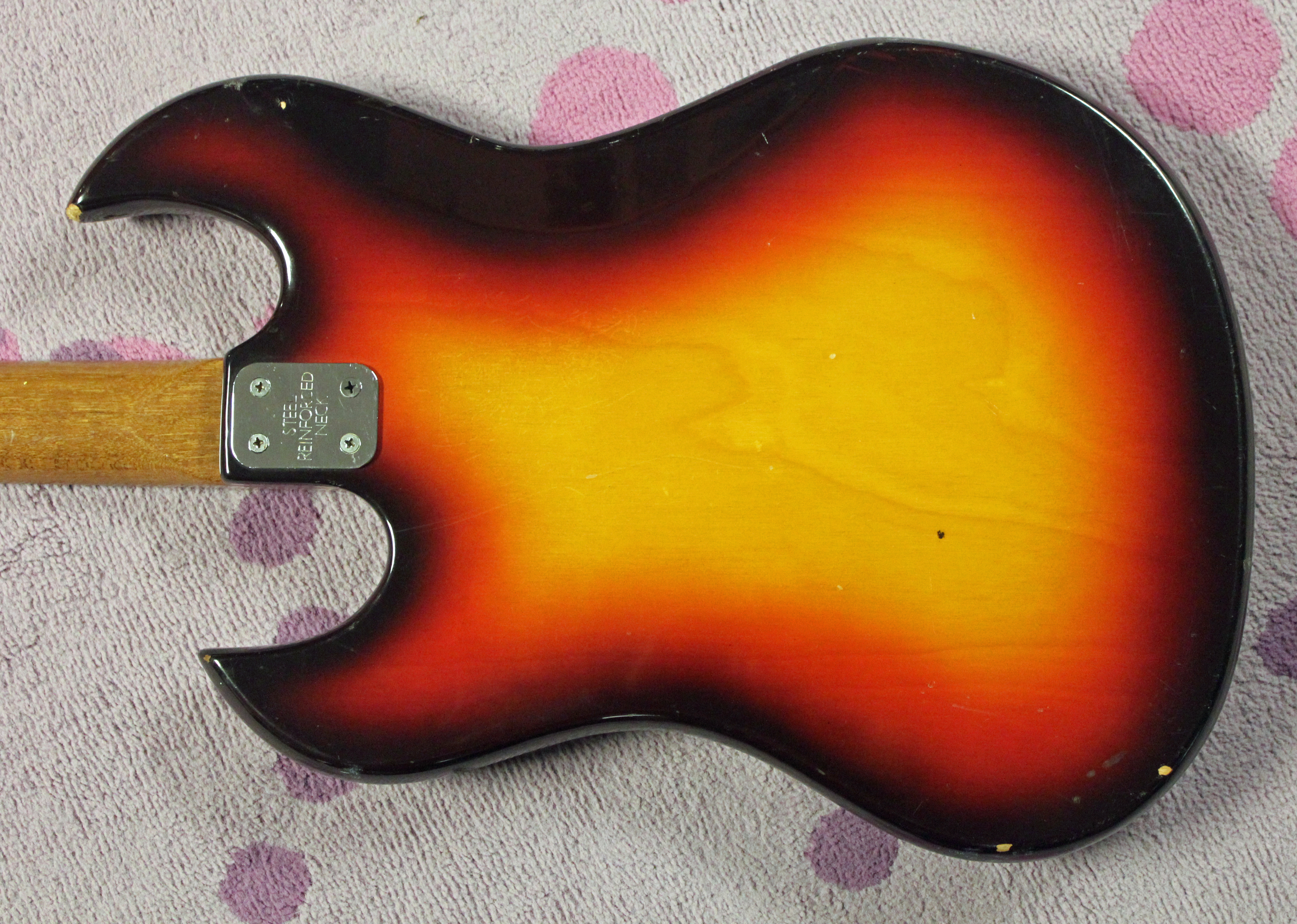 I own this model which was stripped by a former owner. This has revealed something to me that owners of more original condition instruments may not know. The construction may surprise you. The body is (what I refer to as ) butcher block style, small sections of parallel dark mahogany glued together, a total of 6 pieces I believe. And, over the front and back is a veneer of wood to give the sunburst finish a nice appearance. I appears to me that the veneer is spruce, like the body of what an acoustic guitar top usually is. Without the black, amber and yellow finish sprayed over it the contrast of the two body woods is very distinctive where the beveling of the contour on the front and back occur.