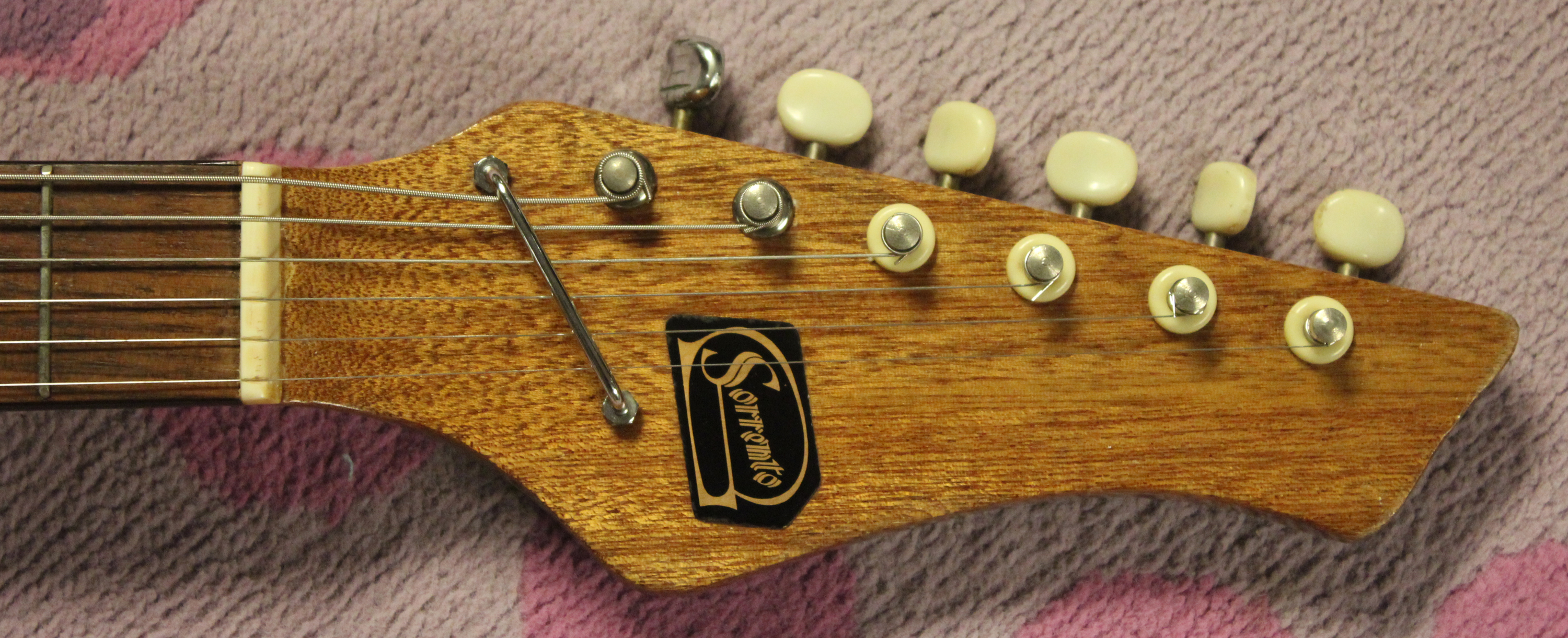 Just look at this design! Man, if there was ever a guitar destined for the name “Swinger,” it’s this one! This exact guitar design was branded with a few names, like this Sorrento guitar. If you bought a Kingston branded model, it said Swinger up there on the headstock. This design was a Kingston “exclusive” design, sold through Westheimer Co. in Chicago.