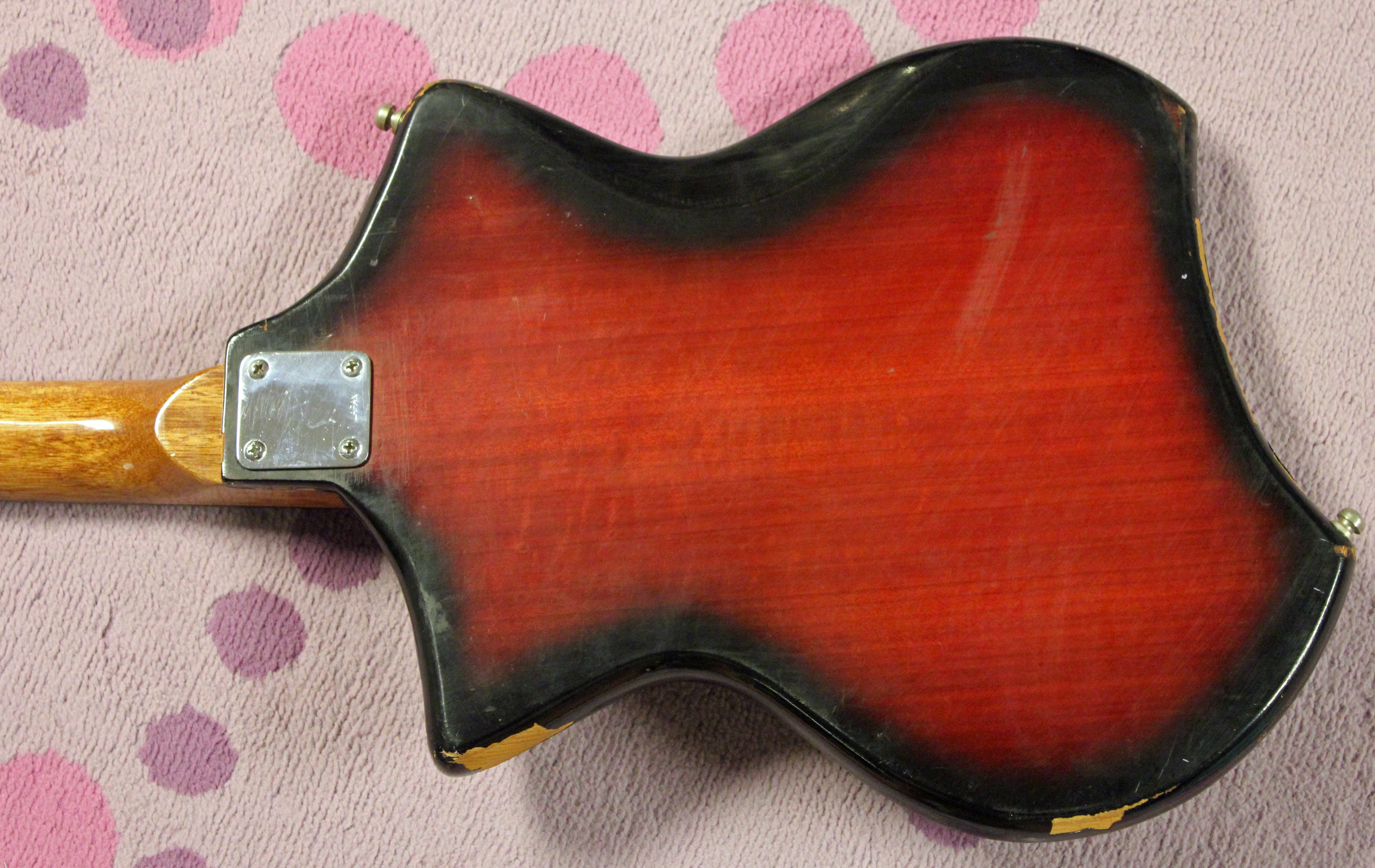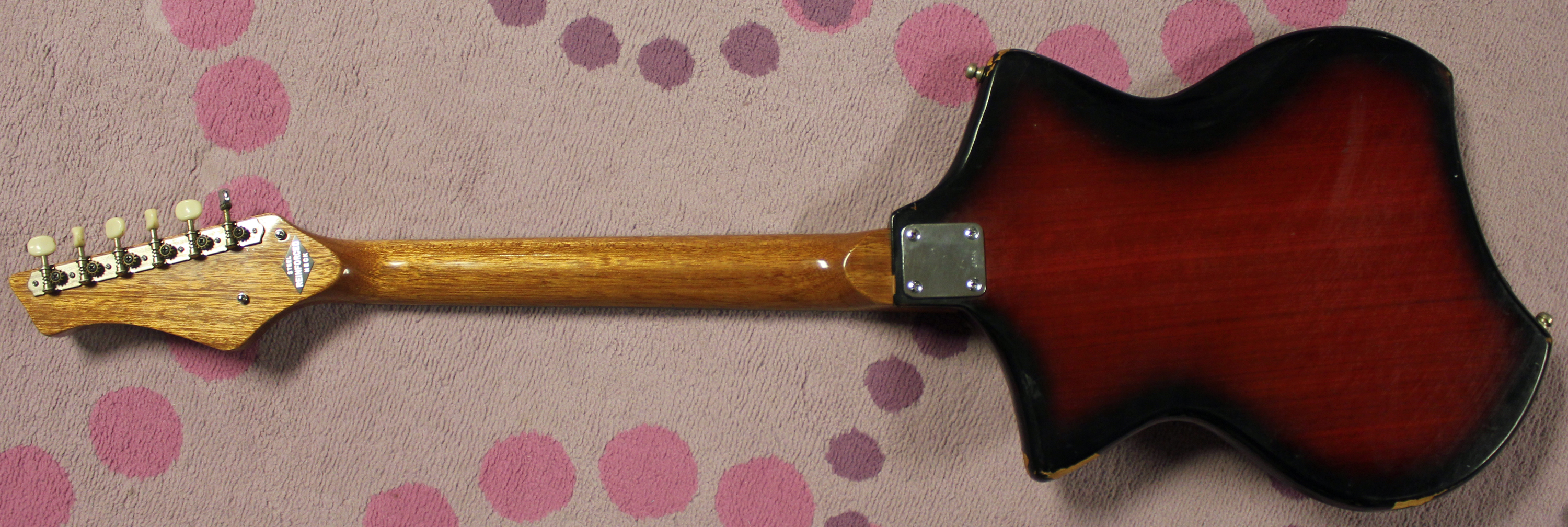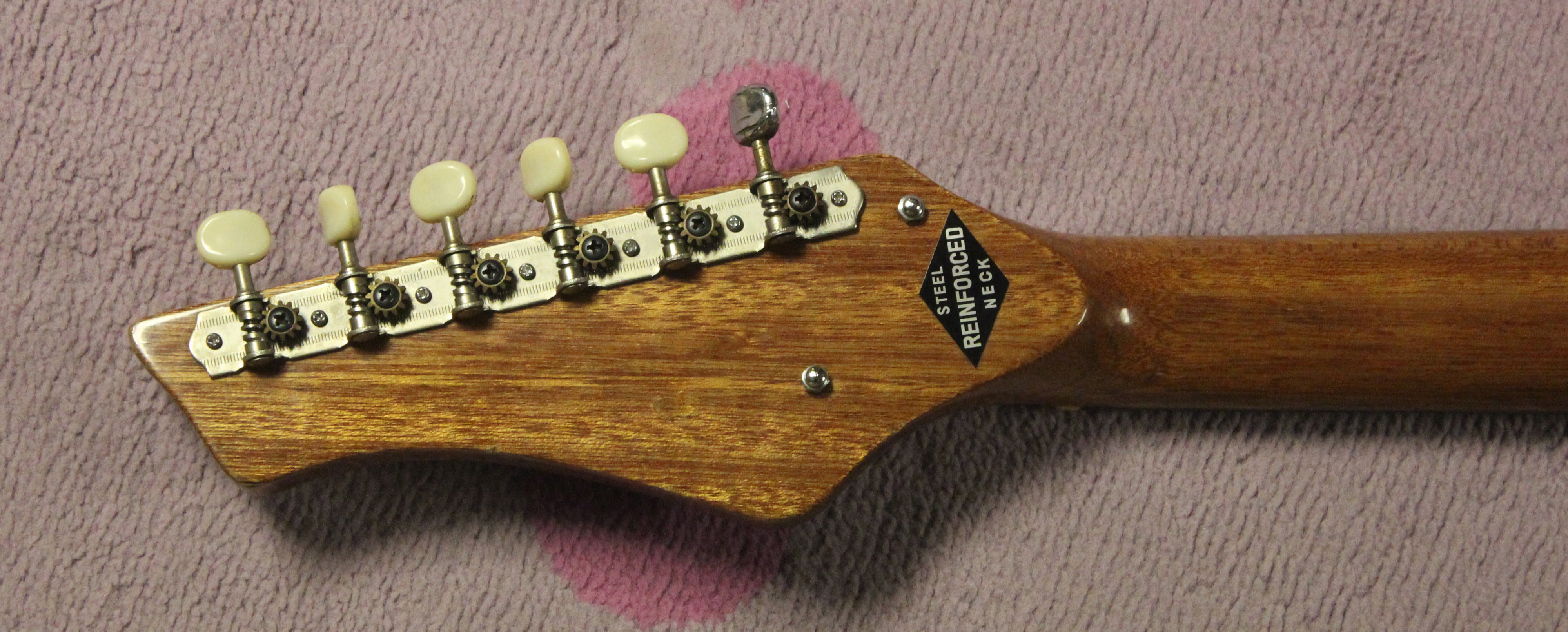 Oh wait, were we talking about gutiars? Oh yeah. See what happens with that darn Jack Westheimer and his model names?!?! Bless that old Jack. Anyway, this was a Kawai-made guitar and kind of standard fare for the time. This guitar was built on the cheaper side, because of the non-adjustable truss rod. And see how the striped pickguard borrows from the Teisco design? To be fair, Teisco borrowed that design from another company in Japan, but that’s a story for another time. One benefit of the non-adjustable truss rod was that the necks were made bigger to support the strings. So if you like bigger neck profiles, you’ll probably dig these guitars.