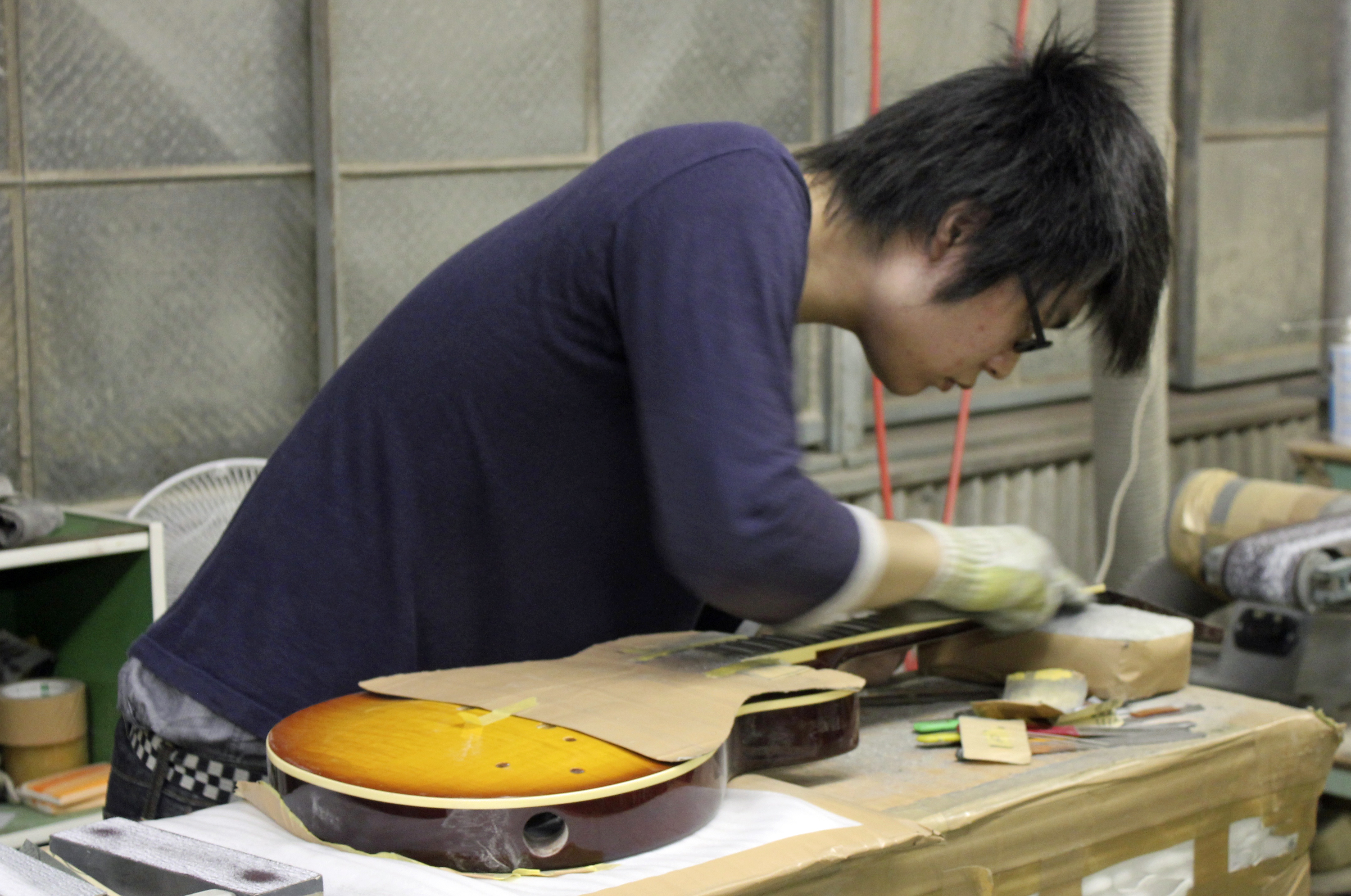 Fret-work is still done by hand, and I was always impressed with the labor involved in making the guitars. This guy was rounding the fret edges to get that nice “rolled” feel. The finish work was also being done in-house, and all the guitars had excellent finishes. In fact, the painting section was really cool to see since Tokai had several custom finishes there. Tokai’s creativity was always really evident.