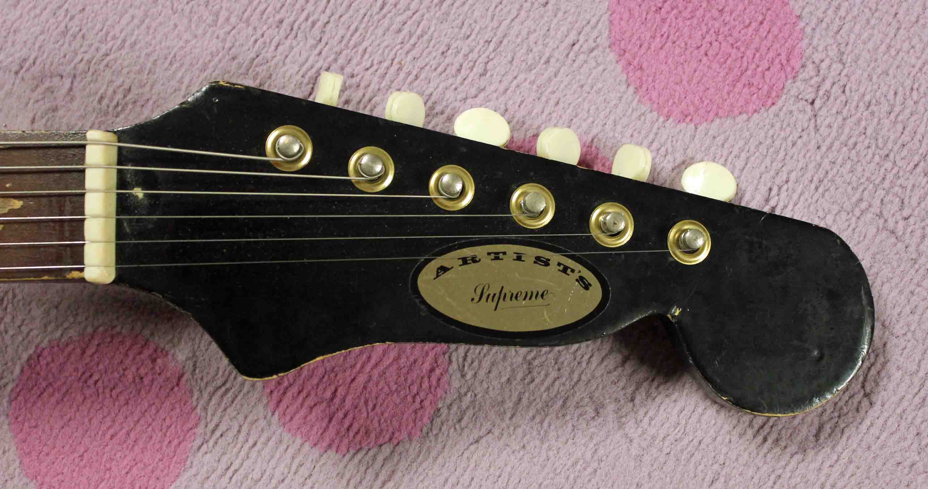 Here’s another one of those guitars that just surprised me from the start.  I mean, “Artist’s Supreme”?!?!  Man, the guitar brand names of the 60s just never end!  But aside from that brand name what we have here is a mid 60s (probably 64) Zenon made import that features all the typical traits of the time.  This guitar came from a large collection, most likely a hoarder of sorts.  There were a ton of guitars that were in storage, and some fellow nut had acquired every old guitar he could get his hands on.  But most of them were old Japanese electrics, probably because he could buy so many for such little money!Zenon Artist Supreme 2