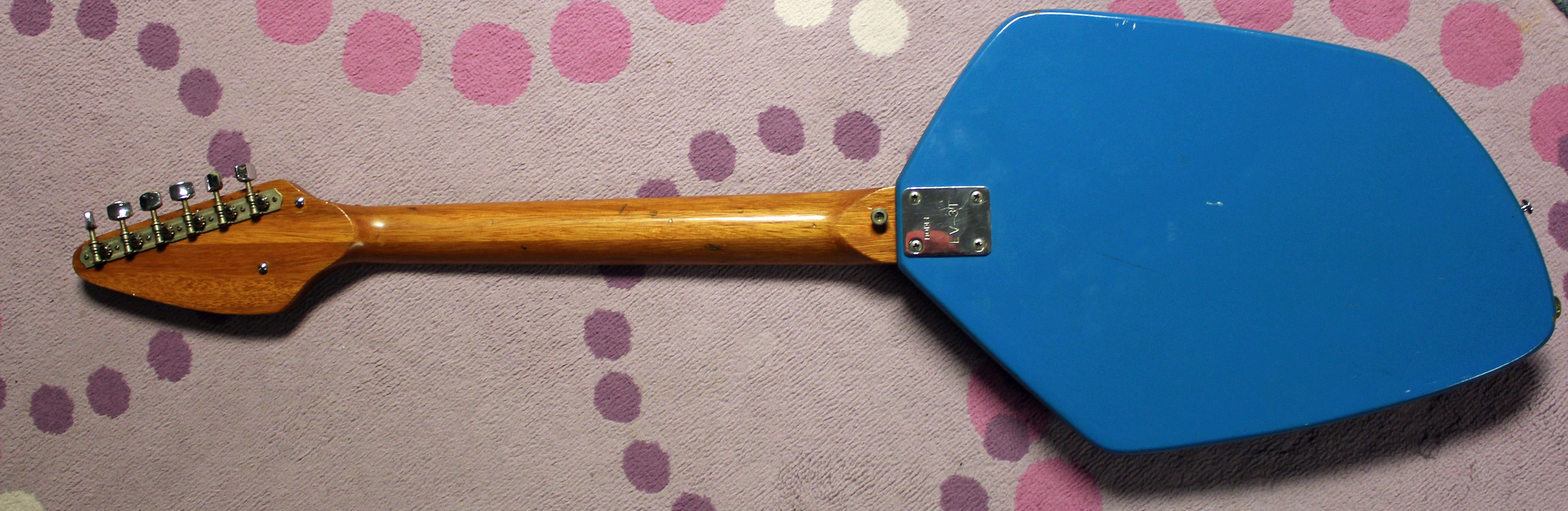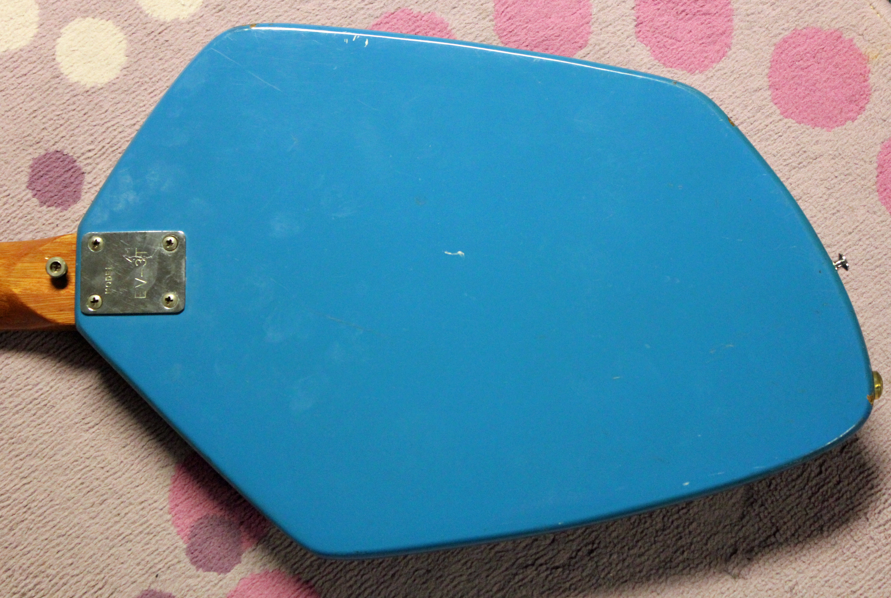 Are you wondering, “How does this guy know for sure?” Well, there’s a simple reason behind this meandering tale. And if you have the attention and comprehension skills to make it this far, then you deserve to know. This guitar’s body is made of plywood. Yep, and guess what? Guitars made at the Teisco factory during the 1960s, didn’t use plywood for the bodies (well, actually the very early, heavy, and short lived SD-4L and SD-2L Teisco guitars that were covered with laminate tops used some kind of heavy wood that may have been construction grade ply). And Teisco branded guitars made at the Kawai factory during the 1960s weren’t made with plywood bodies either! Of course there may have been a stray example here and there, but as a general rule and from my interview with the Kawai factory manager of the time, Kawai used solid woods for all Teisco solid body electric guitars. There are other small components and features that separate this guitar from Teisco guitars, but I won’t bore you with the color of grounding wires, or the dimensions of neck pockets, or the use of string retainers, or the variations of Teisco pickups. Let’s just say if you have a guitar with a plywood body, and I’m not talking sandwich construction, then it probably it isn’t a Teisco.