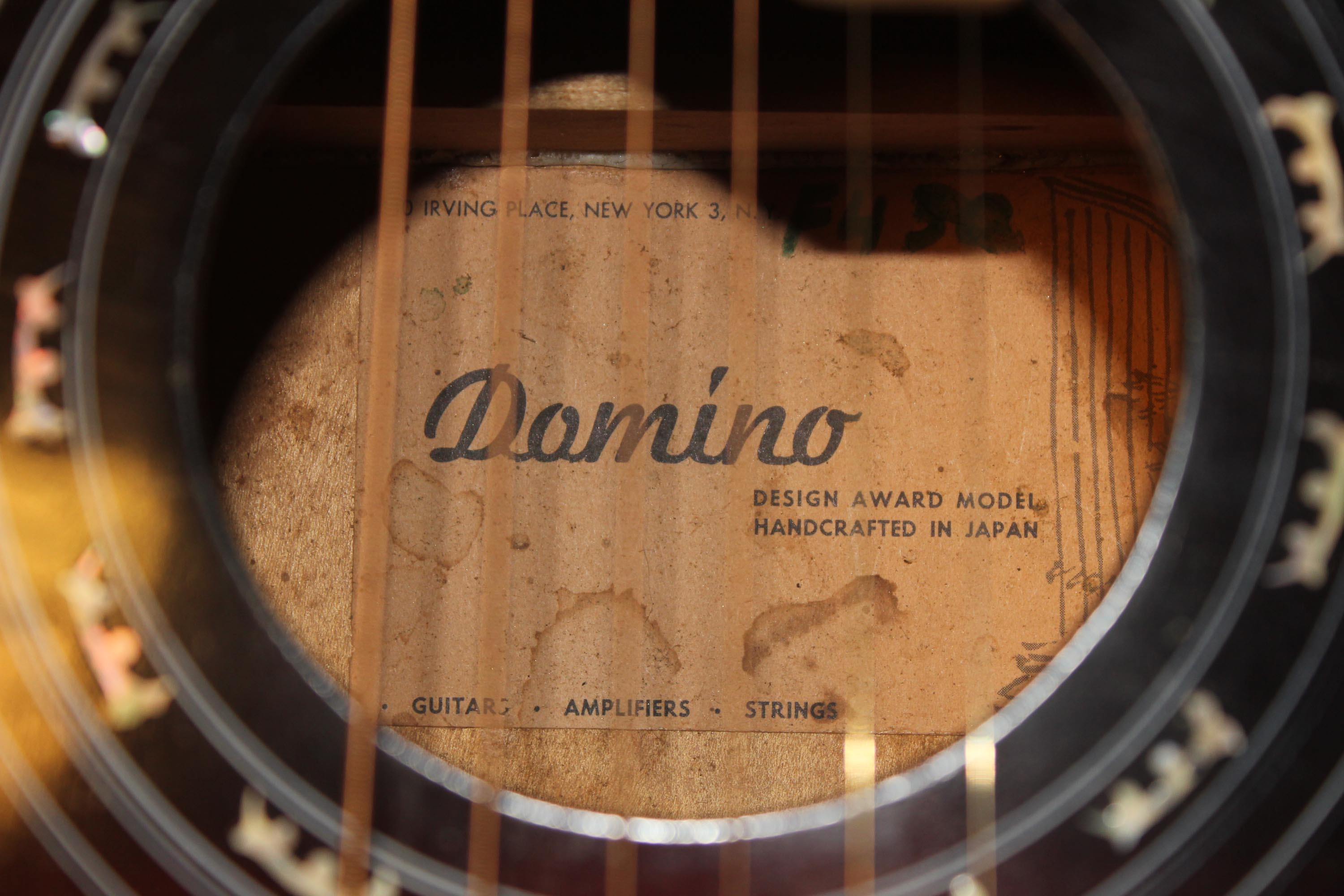 Domino Maruha 1Well, would you check out this gorgeous guitar?  Hailing from the late 50s, this fancy slice of bread represents one of the earliest Japanese import guitars made by one of the oldest guitar makers in Japan.Domino Maruha 2Maruha Gakki began making acoustic and hollow body guitars in 1948.  Located in Fukuoka Prefecture and the city of Kurume, the company was one of the original suppliers of guitar bodies and necks for Teisco and Elk guitars.  Maruha Gakki built very high quality guitars for the era, with finishes and inlay work that surpassed many US builders such as Harmony and Kay.Domino Maruha 7This particular finish is like a swirled varnish…I’m not sure what to call it but it’s like someone took a rag or sponge and swirled in the darker stain.  It’s a truly gorgeous burst effect that’s totally visually stunning.  Very nice.Domino Maruha 3I’ve seen these guitars in Japan labeled as Maruha, and in the states as Domino Guitars.  There were a few different models imported by Domino during this time, including a simple parlor guitar, a larger concert model, and this round hole arch top.Domino Maruha 5Domino Maruha 4Domino Maruha 6This guitar had a wonderful, full V-neck and some very solid construction.  Interesting bracing inside allowed for one of the coolest arch tops I’d ever seen.  In fact, I didn’t even know that a round-hole arch top existed until I bought this guitar!  Apparently the design was en vogue for a few years in the 50s, but it truly was unique in build style and I liked it quite a bit.  The neck wasn’t adjustable and did need some serious heat work, but the frets were great and the tuners were quality.Domino Maruha 8Domino Maruha 9It was really hard to photograph the arch here, but basically the guitar top flattened out around the sound hole and then bulged up where the bridge was located.  The sound always seemed a bit restrained to my ears, but standing out in front the guitar projected like a cannon and just had a great sound.  This is one of those guitars that I always regretted selling!
