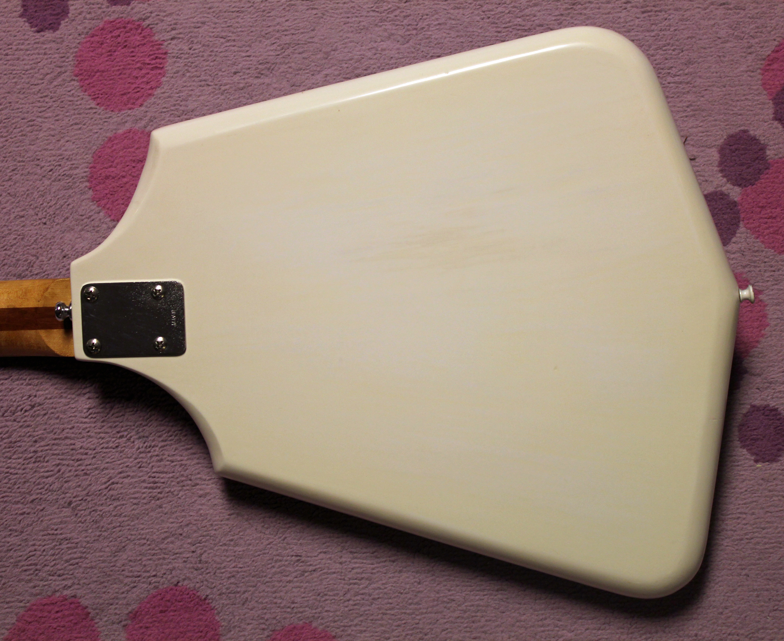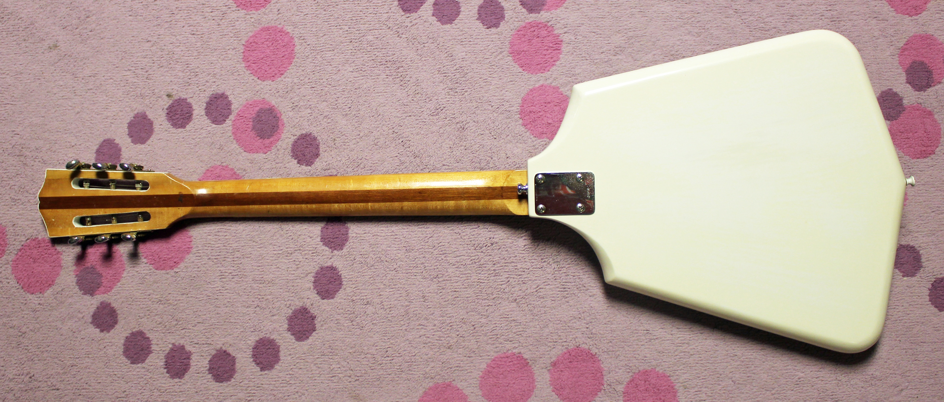 This guitar is only partially acoustic, with a hollowed out portion under the sound hole. But otherwise this is a solid body guitar. These were also described as short scale guitars, although they feature the same scale length as a Gibson Les Paul. Go figure! Other features included a “slender jazz neck”( measuring at 1 5/8″ at the first fret and 2” wide at the 21st fret), a “micrometrically adjustable roller bridge”, and a flip up mute at the bridge.